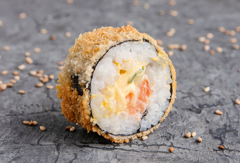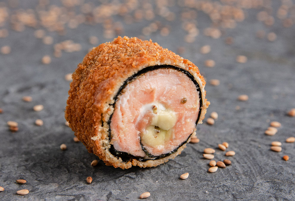Sin arroz. Relleno de salm�n, queso philadelphia, palta y alga rebozada.